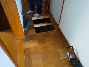 玄関前の廊下を歩く際に床鳴りがするので、改善できないかとのご依頼がありました💡